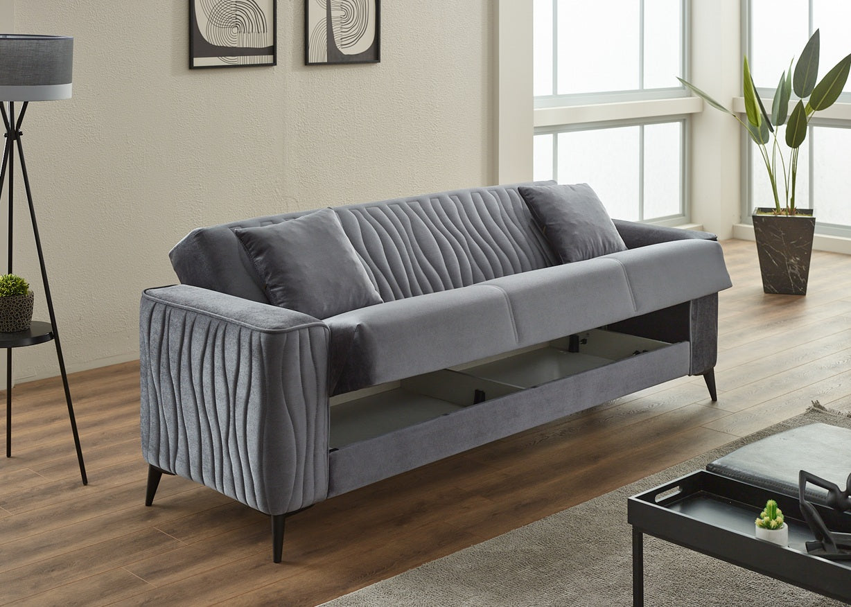 Integrierter Stauraum unter den Sitzflächen bietet ausreichend Platz für Decken, Kissen oder andere Wohnaccessoires.